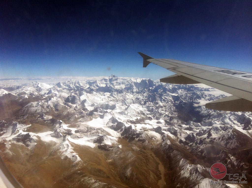 Armeeflugzeuge. Ob deshalb, oder warum auch immer, unser Flug hat fast zwei Stunden Verspätung. Der Flug über den Himalaja entschädigt aber für alles – da ist es, das