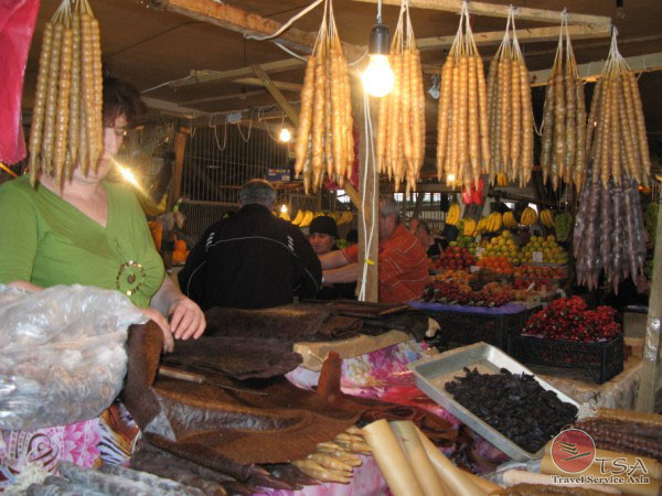 nutzten wir zur Besichtigung des Marktes. Die Vielfalt der Früchte sowie andere für uns teilweise unbekannte Waren ist beeindruckend. Wir kauften Tschurtsch-chela(Walnüsse mit
