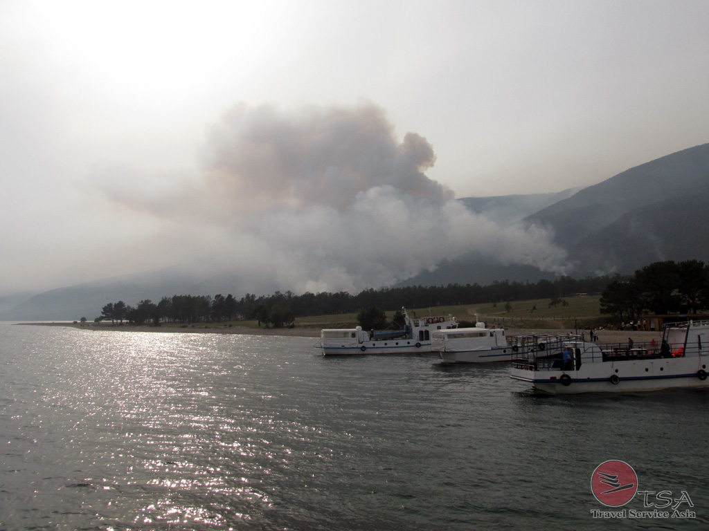 Am nächsten Morgen nach dem Frühstück gingen wir zum "Hafen". Dort war ein Ausflugsschiff und es warteten bereits viele Leute. Nach einiger Wartezeit durften wir auf das Schiff und es legte endlich ab. Wir schipperten lange Zeit entlang der Küste Olchons bis wir an der kleinen, unbewohnten Insel Ogoj anlegten. Dort gibt es eine heilige Stätte der Buddhisten. Außerdem ist von dort auch ein sehr schöner Aussichtspunkt. Nur leider hielt sich der Nebel durch die Waldbrände hartnäckig! Wir gingen zurück zum Schiff und es ging weiter bis ans Festland zu einer heiligen Quelle. Gleich daneben waren ein paar Flammen zu sehen! Einige löschten mit einer Flasche voll heiligen Wassers einige Brandherde, was sich jedoch als aussichtslos erwies.
