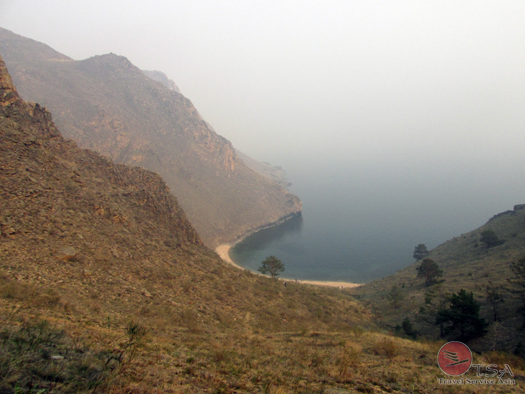 Am nächsten Tag gingen wir Richtung Strand, machten einige Fotos und erholten uns beim Bad im Baikalsee (bei ca. 20 Grad Wassertemperatur) und am Strand in der Nähe des Schaman-Felsens. Bei schönem Wetter kann man die gegenüberliegende Uferseite sehen, aber es wüteten gerade die Waldbrände, so daß die Sicht "vernebelt" war und wir die grandiose Landschaft leider nicht bewundern konnten.