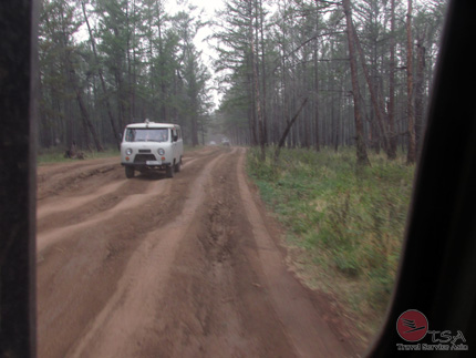 Am folgenden Tag wurden wir nach dem Frühstück mit einem UAZ (geländegängiges Allrad-Fahrzeug) von unserer Unterkunft abgeholt und es ging über teilweise abenteuerliche Wege über Schotter, Stock und Stein und mehreren Zwischenstopps an sehenswerten Plätzen bis Choboj (nördlichster Punkt Olchons).