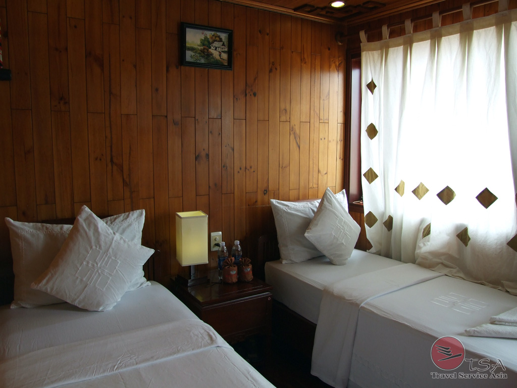 Nach dem Mittagessen blieb Zeit zum Entspannen an Deck des umgebauten Reiskutters. Das Schiff verfügt über nur 14 Kabinen. Die Doppelkabinen sind recht klein aber behaglich. Es gibt ein kleines Badezimmer mit Dusche/WC. Zu den Annehmlichkeiten des Schiffs gehört eine Sonnenterrasse und das Bordrestaurant.