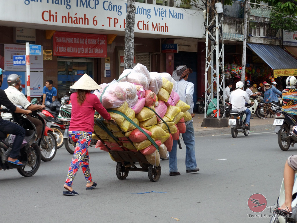 Die Reise begann mit einer Besichtigung in Saigon. Überall wo man hinschaut, trifft das traditionelle Leben auf das moderne Leben. Augenscheinlich sind die unglaublich vielen Mopeds, die durch die Metropole brausen. Mopeds sind die Hauptbeförderungsmittel für die Vietnamesen, da das öffentliche Verkehrsnetz kaum ausgebaut ist und Autos für die meisten Vietnamesen zu teuer sind. Dadurch sind ganze Familien auf einem Moped (auch Babys, die in einer Decke eingewickelt im Arm ihrer Mutter gehalten werden) keine Seltenheit im Verkehr. Man glaubt auch kaum welch riesige Lasten auf einem Moped transportiert werden können. Ich besuchte die Hauptpost und die Notre Dame Kathedrale.