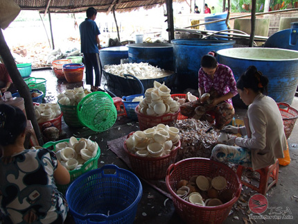 Am Sonntag hieß es Abschied nehmen von Saigon, das Mekong Delta wartete darauf erkundet zu werden. Mit dem Auto ging es in ca. 2 Stunden nach Ben Tre von wo aus die Reise mit dem Boot auf dem Mekong weiterging, durch eine üppige Vegetation am Ufer. Hier boten sich zahlreiche schöne Fotomotive. Unterwegs wurde Halt gemacht an einer Ziegelei, die Reisspelzen als Brennstoff benutzt. Danach folgte ein weiterer Stopp bei einem Familienbetrieb der Kokosnüsse verarbeitet. Ein wahrer Knochenjob, die harten Kokosnüsse mit der Hand zu bearbeiten! Hier wurden Besteck und Schmuck aber auch Süßigkeiten aus Kokos angeboten.