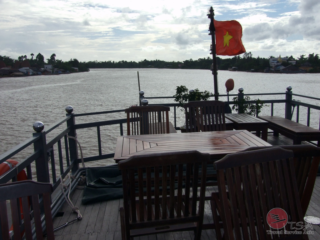 Die 2 Bettkabine und Sonnenterasse an Bord der "Mekong Eyes"